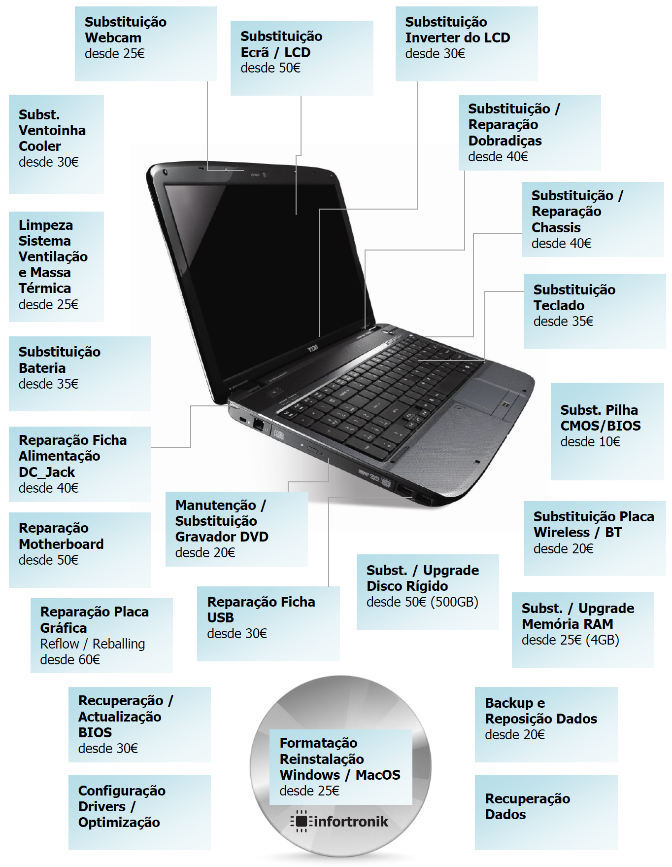 Na Infortronik somos especializados em assistência técnica informática, direcionada essencialmente a reparações eletrónicas de computadores portáteis.
